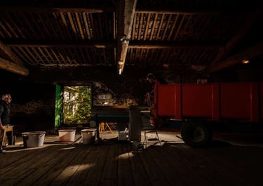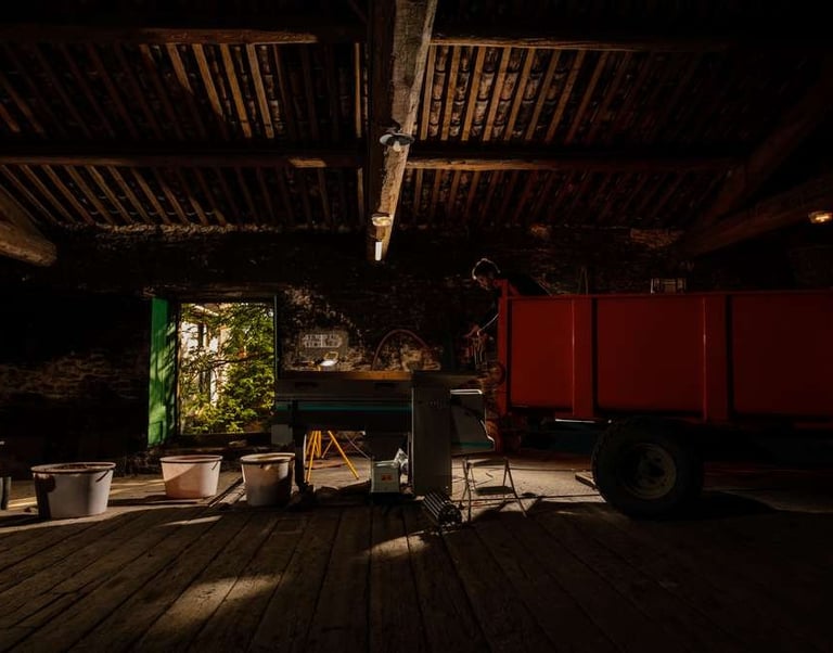 Nos anciens n’avaient pas la technologie, mais ils avaient le bon sens et le respect de bonnes pratiques : pas besoin de pompage et de trituration de vendanges, le travail se fait dans la douceur et dans la fluidité, le principe est naturel, il est et reste celui de la gravité. Le pressoir est hydraulique et vertical, en vieil artisan respectueux du fruit.