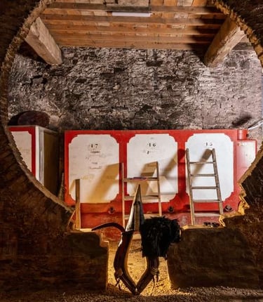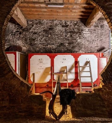 La grande cave est aussi la mémoire des 7 générations de vignerons. De belles arches en pierres , vestiges des vieux foudres , côtoient des cuves bétons et accueillent les nouvellex cuves inox, dans des jeux d’ombres et de lumières donnant sa magie à la cave. La transformation est aussi dans les pratiques vinicoles.
